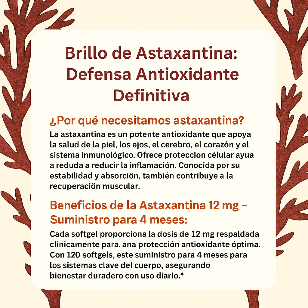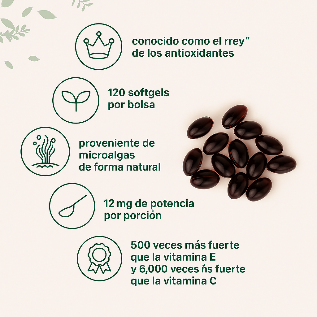 La astaxantina es un antioxidante natural reconocido por apoyar la salud visual, el bienestar de la piel, la energía diaria y la protección frente al estrés oxidativo. No es un medicamento; es un suplemento para complementar un estilo de vida saludable.