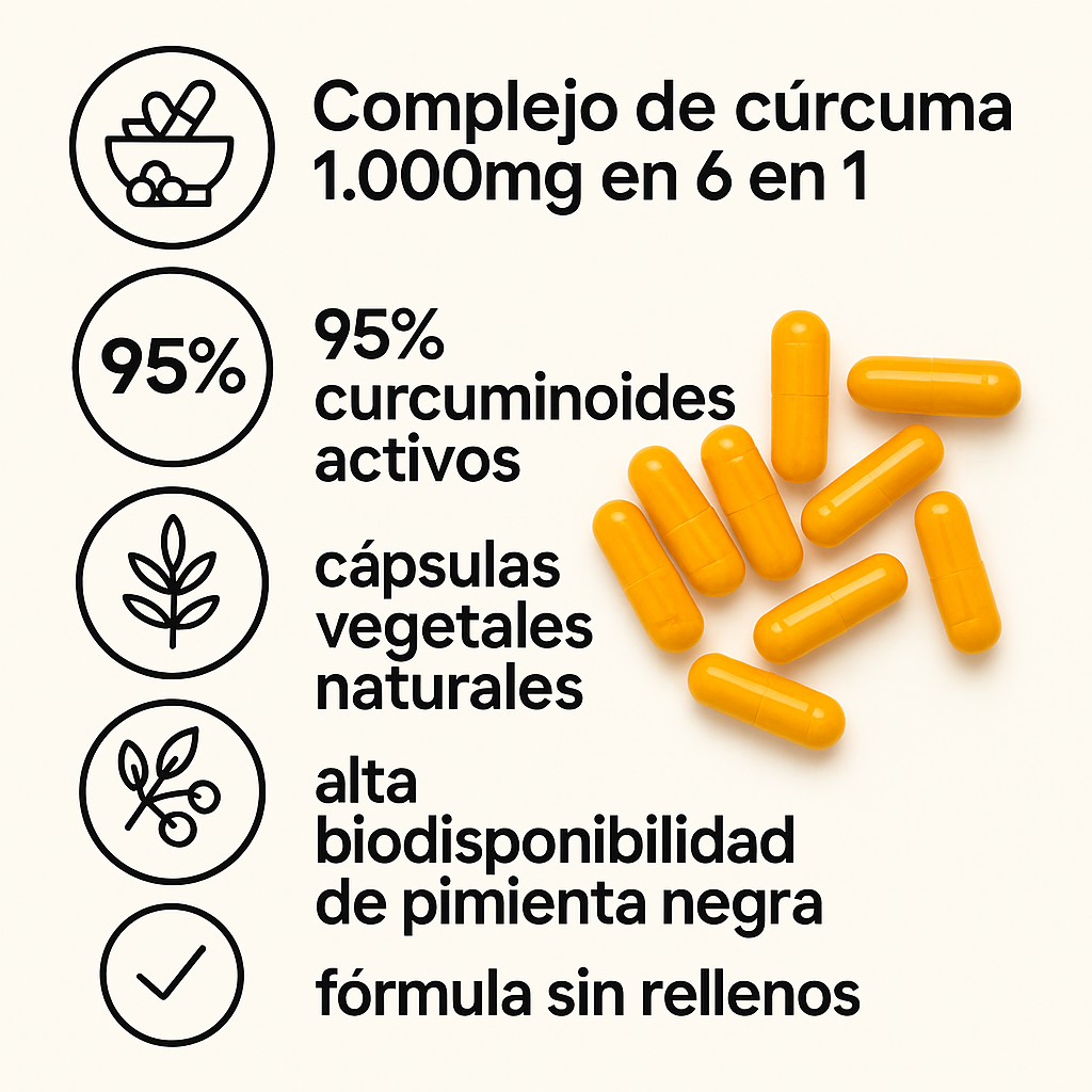 La mayoría de los suplementos de cúrcuma utilizan principalmente polvo de raíz de cúrcuma con bajos niveles de curcumina. El nuestro contiene un 95 % de curcuminoides (el compuesto activo), además de ingredientes que mejoran la absorción y potencian su eficacia.