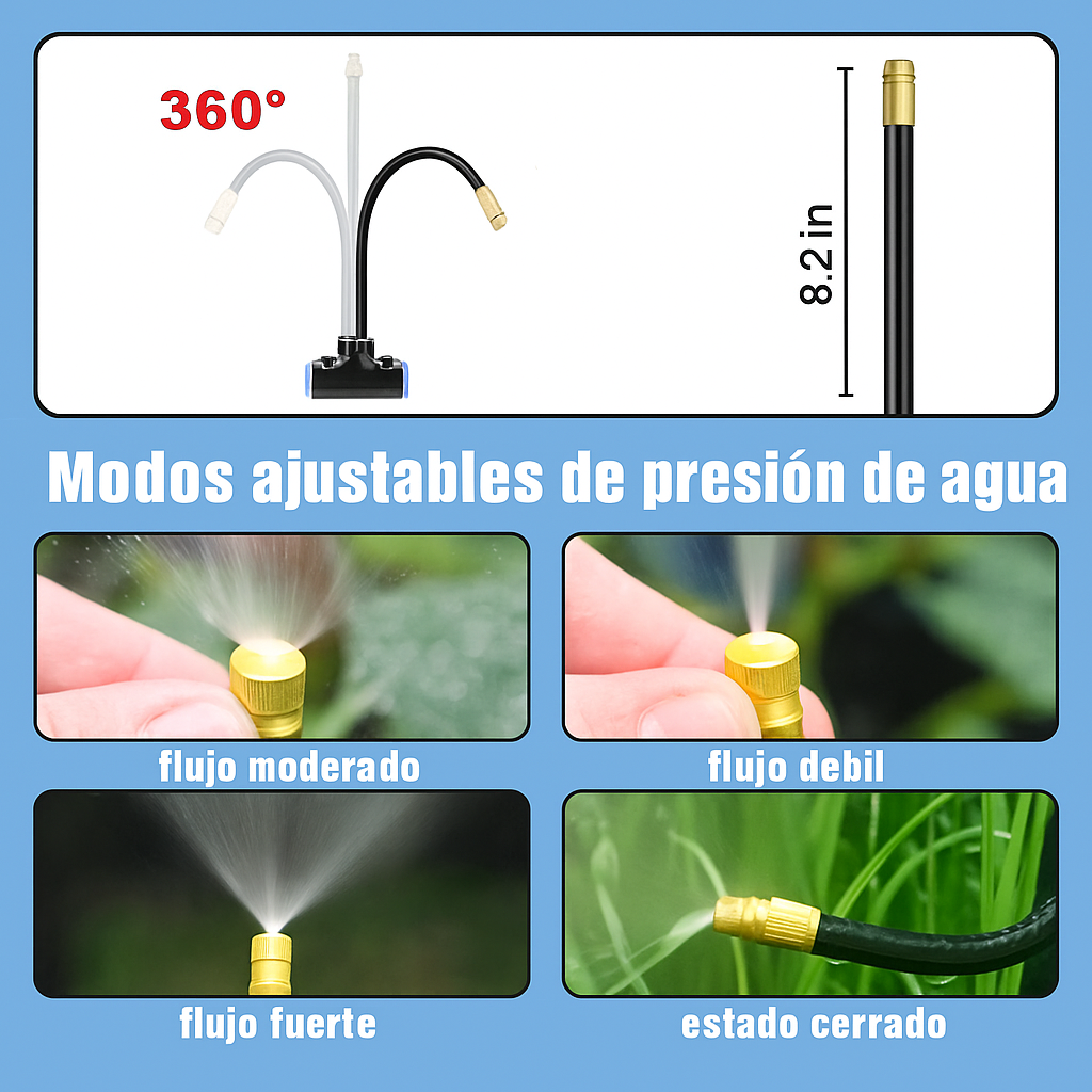 Conuna boquilla universal de 360° yuna longitud mejoradade 20 cm (7,87 pulgadas), este sistema permite girar la boquilla para ajustarel flujo de agua, desde una línea recta hasta un abanico. La manguera de la boquilla se puede girar manualmenteen cualquier direcciónparauna cobertura mucho mayor, de 0,5 a 1 m (20 a 40 pulgadas).Cada boquilla es reemplazable; su diseño desmontable facilita la limpieza.