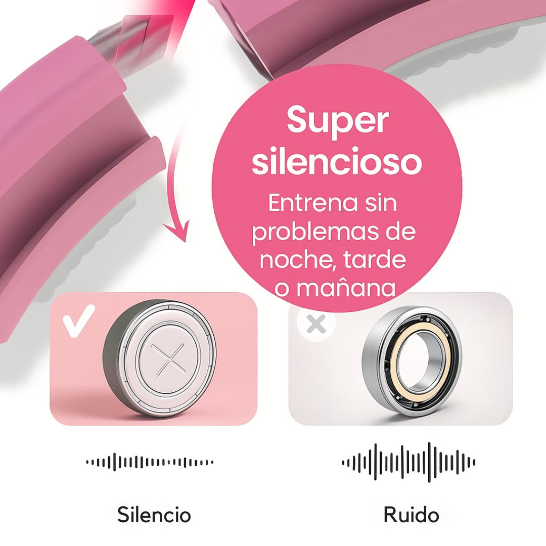 Gracias a nuestro avanzado diseño con rodamientos de bolas , elHoopsidePro ofrece una experiencia hasta un 90 % más silenciosa que los hula hoops convencionales. Sumérgete en un mundo donde tu entrenamiento no solo es eficiente, sino también excepcionalmente silencioso y agradable.